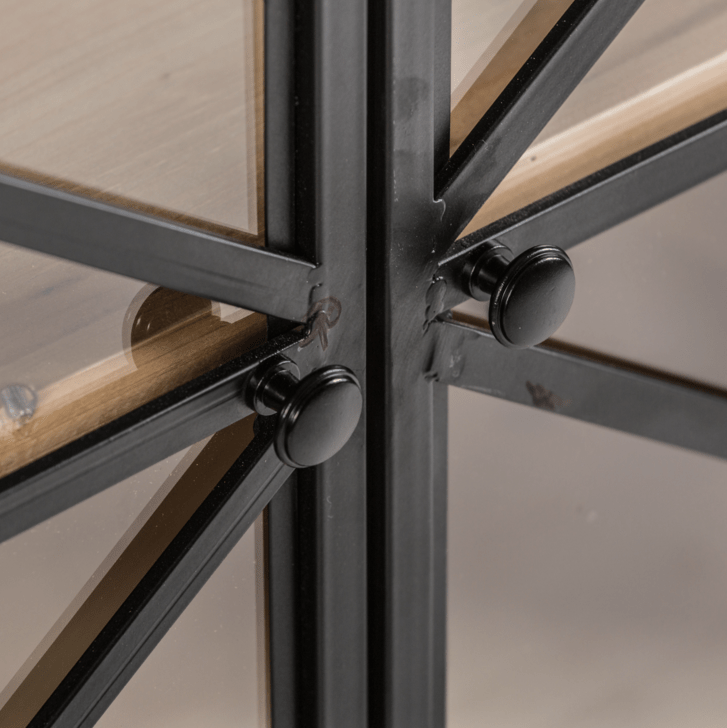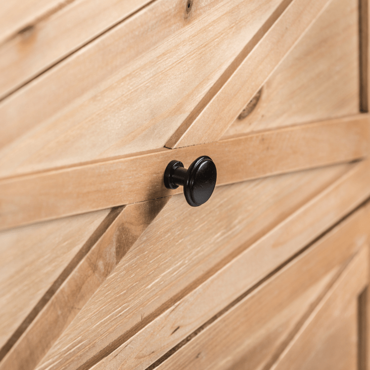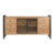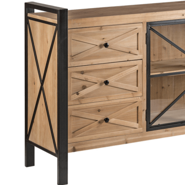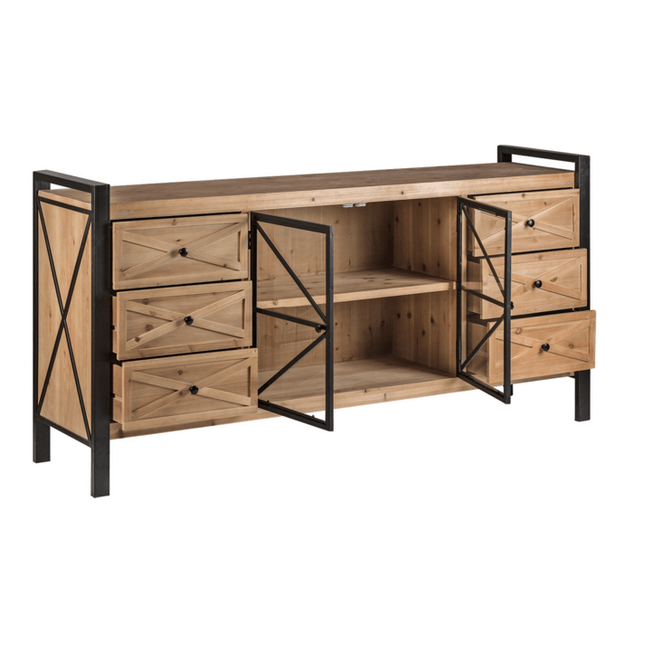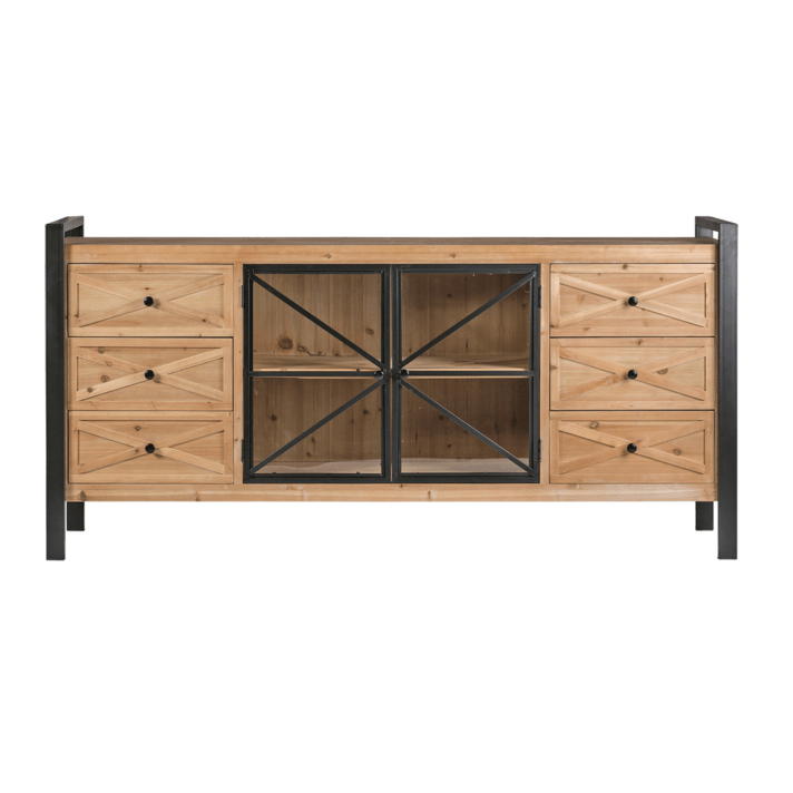 Aparador de dos puertas de estructura metálica, cristal interior, seis cajones y pomos metálicos .Está realizado en madera pino acabado natural y elementos de metal negro.