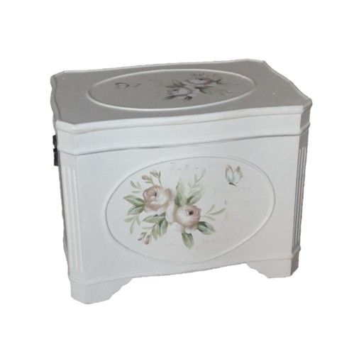 Baúl realizado en madera dm y decorado a mano con un motivo floral en la parte superior y frontal.Guarda pequeños objetos y no pierdas el estilo romántico en tu decoración.