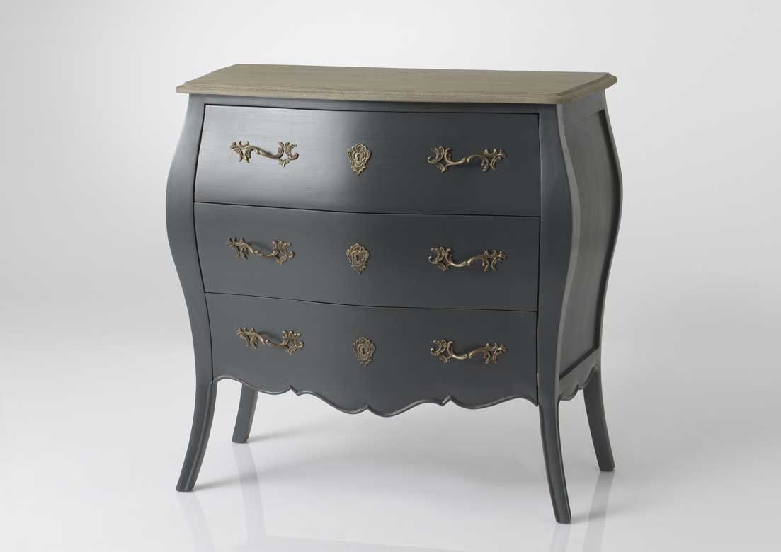 Cómoda de tres cajones realizada en madera con acabado gris plomo y sobre en madera gris envejecido.Es preciosa por todos sus detalles, la ondulación de los cajones ,el leve perfilado, el sobre a contraste, los tiradores en metal envejecido.
