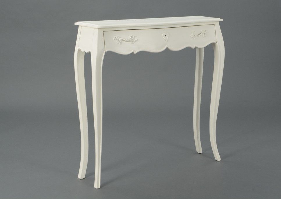 Consola realizada en madera con diseño de líneas curvas muy representativa del estilo Vintage Francés. Cuenta con un cajón frontal para almacenaje y resulta bastante práctica para utilizar en recibidores de escasas dimensiones. Podemos complementar su decoración acompañándola con un espejo blanco de estilo francés o bien un espejo veneciano, lo que le aportaría un toque de distinción muy elegante. Si en lugar de espejo preferís realizar vuestra decoración con un cuadro, escoged una enmarcado de líneas barrocas o más simplificadas, pero en blanco roto similar a la consola, ya que al ser una pieza bastante liviana mezclar otros acabados le restaría protagonismo.