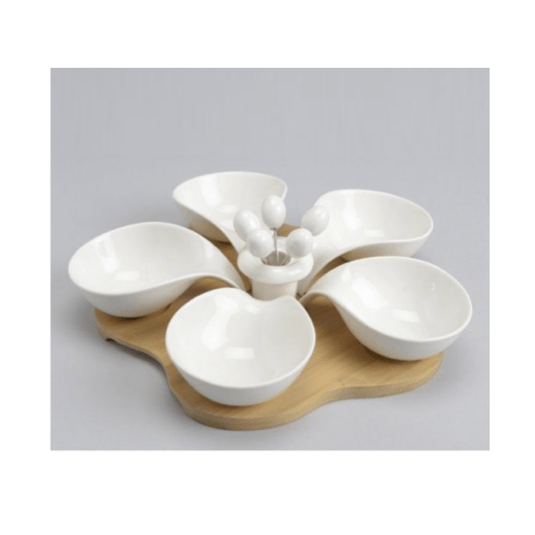 Entremesera en porcelana blanca con bandeja soporte en madera de tono natural.La entremesera simula una flor,cada platito con forma redondeada es el pétalo que confluye en el centro con el vasito,soporte de unos pinchos de metal ,acabados en una bolita de porcelana blanca.Pon una nota divertida a tus reuniones con familiares y amigos y atrévete a mezclar piezas diferentes en tu mesa junto a tu vajilla.El conjunto lo compone 1 bandeja,5 platitos o cuencos, 1 vasito y 5 pinchos.