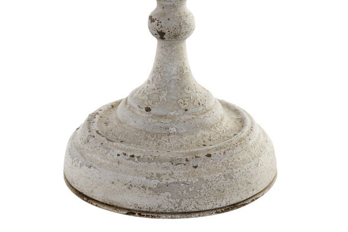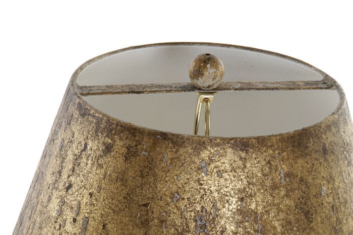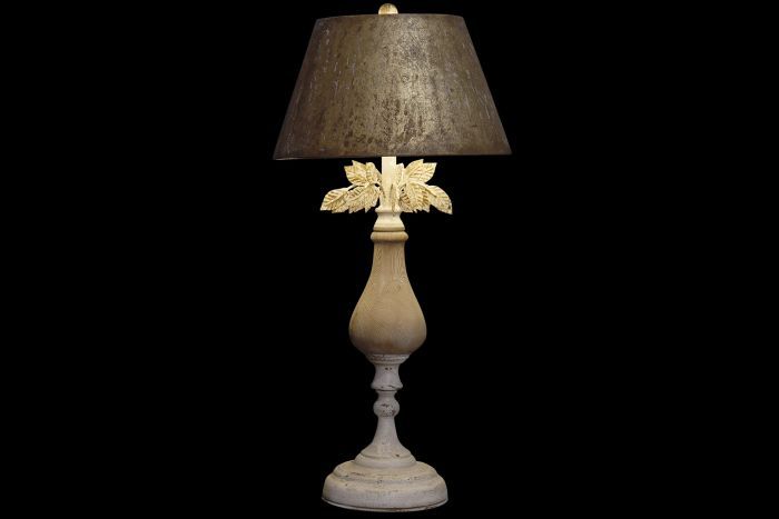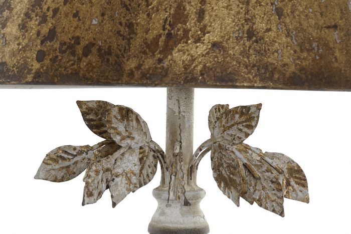 Lámpara de sobremesa en metal envejecido con base combinada en madera color nuez y pantalla metálica. Unas hojas metálicas coronan la base a la altura del porta bombillas.