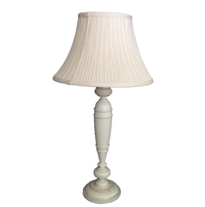 Lámpara sobremesa en madera marfil patinada .El pie de esta pantalla torneada aún siendo un clásico con este acabado ,la apariencia es más ligera.Lleva pantalla plisada incluida en el precio.