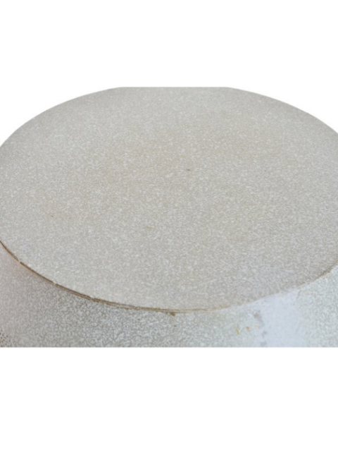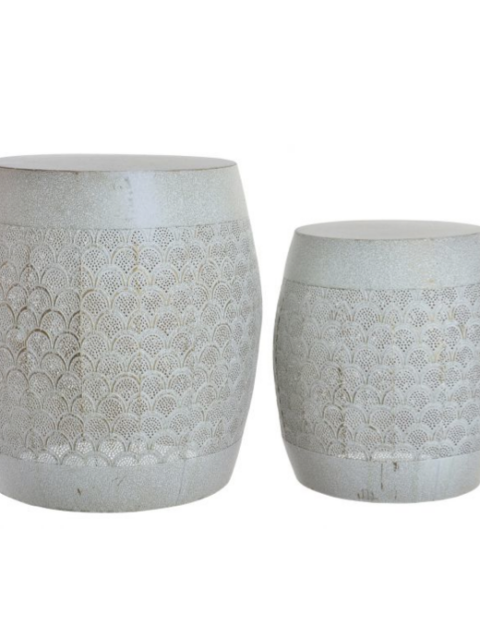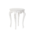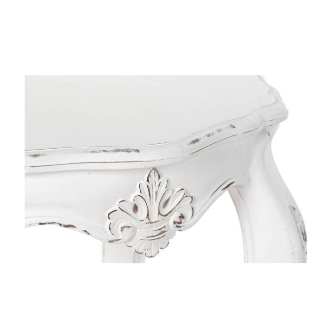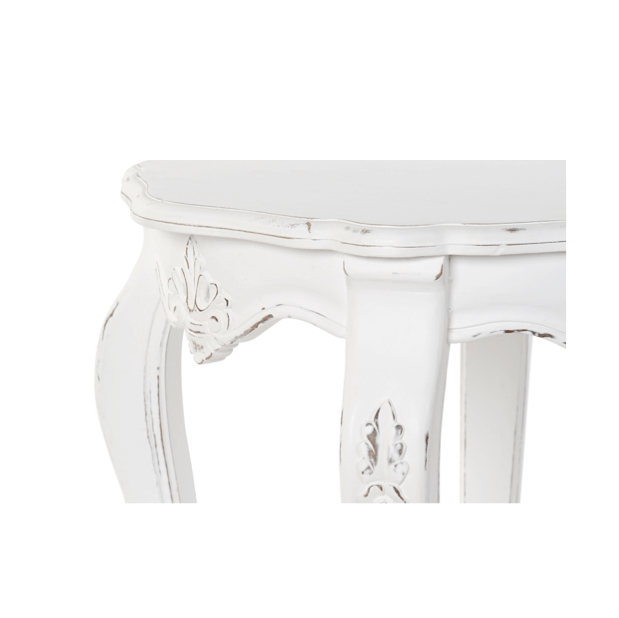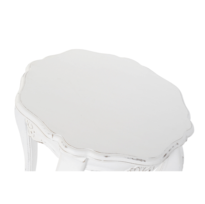 Mesa auxiliar madera de mango blanca decapé.La talla en el faldón y la flor en las patas le confiere un aire romántico afrancesado.Laprte superior ondulada le aporta caracter.