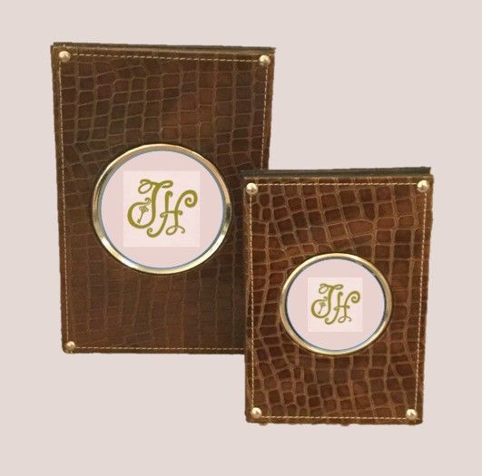 Pareja portafotos piel grabada cocodrilo en dos tamaños color avellana y detalles plateados.